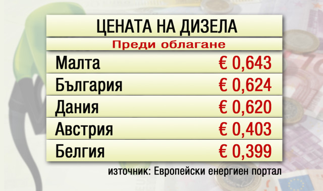 Окончателната дума има антимонополната комисия. В момента дизел и бензин се продават на около 2 лева и 20 стотинки за литър. Въпреки това дизелът у нас остава вторият най-скъп в Евросъюза преди облагане с данъци и акцизи. След поевтиняването в последната седмица в Малта вече дизелът е малко по-скъп. Благодарение на факта, че у нас косвеният налог е възможно най-ниският в Европейския съюз, крайната цена все пак остава по-ниска от средната в останалите страни-членки.