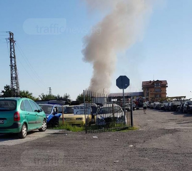 На място има два екипа на пожарната, които гасят пламъците. Съвсем близо до депото за автомобили има и няколко масивни постройки.