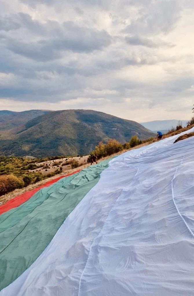 Шестима приятели разгърнаха огромен трибагреник над град Земен в деня на Съединението.
