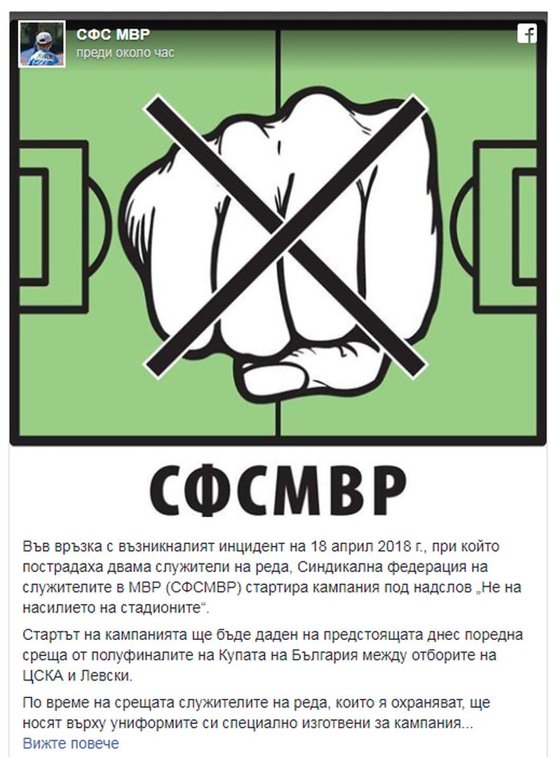 Във връзка с възникналият инцидент на 18 април 2018 г., при който пострадаха двама служители на реда, Синдикална федерация на служителите в МВР (СФСМВР) стартира кампания под надслов "Не на насилието на стадионите". Стартът на кампанията ще бъде даден на днешната среща от полуфиналите на Купата на България между отборите на "ЦСКА-София" и "Левски".