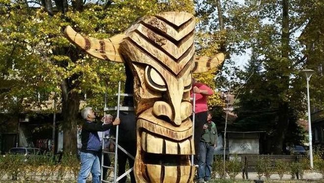 Огромното творение е изработено от топола и е подарък от Димов за общината. Дървото е специално обработено, за да не се поврежда от климатичните условия.