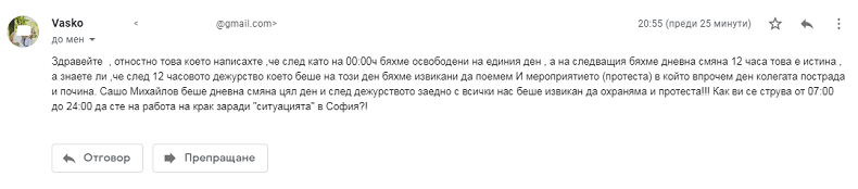 "Здравейте, относно това, което написахте, че след като на 00:00 часа бяхме освободени на единия ден, а на следващия бяхме дневна смяна 12 часа. Това е истината. А знаете ли, че след 12-часовото дежурство, което беше на този ден, бяхме извикани да поемем и мероприятието (протеста), в който ден колегата пострада и почина.