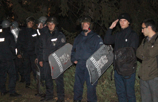 Служителите на МВР обаче не реагираха - така напрежението спадна. Демонстрантите в един момент тръгнаха отново към загражденията, оставяйки ченгетата в градинката.