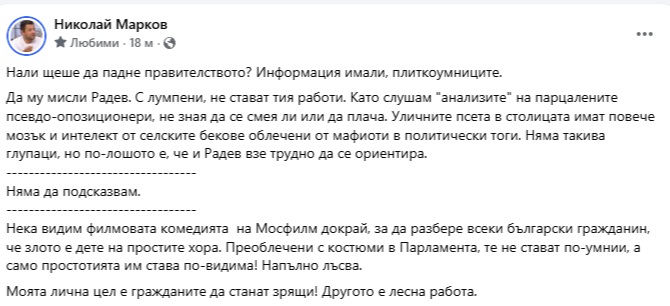 Бившият депутат от "Величие" полковник Николай Марков коментира във Фейсбук поредния провален вот на недоверие към правителството на ГЕРБ-СДС, БСП и "Има такъв народ".