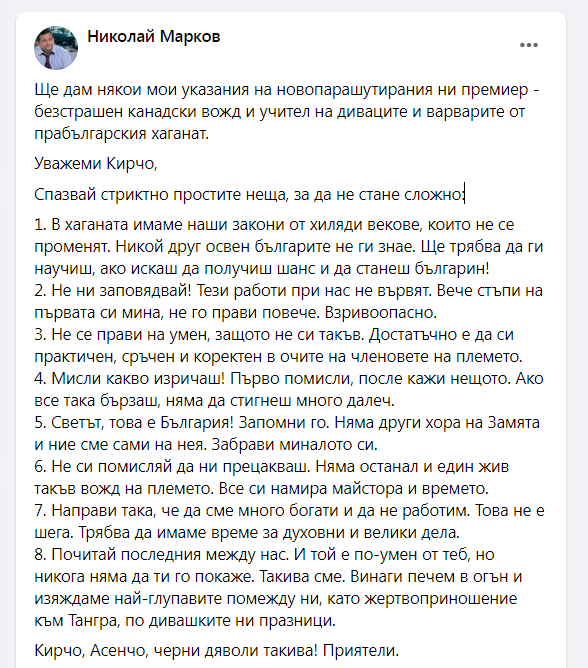 Ще дам някои мои указания на новопарашутирания ни премиер - безстрашен канадски вожд и учител на диваците и варварите от прабългарския хаганат. Това коментира на страницата си във Фейсбук бившият офицер от НСО полк. Николай Марков.