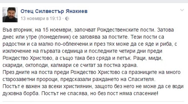 „През дните на поста преди Рождество Христово са празниците на много старозаветни пророци, предсказали раждането на Спасителя. Постът е важен за всеки християнин, защото без него не може да се води духовна борба. Постът не спасява, но без пост няма спасение”, призовава отецът. Освен това Янакиев приканва миряните да записват имената си на страницата му, за да ги спомене в традиционната неделна литургия.