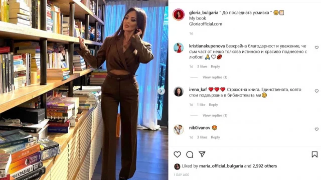 Всъщност, кадърът е част от кампания, която цели да промотира новата книга на изпълнителката "До последната усмивка". "Страхотна книга. Единствената, която стои подвързана в библиотеката ми", пише почитателка на Глория.