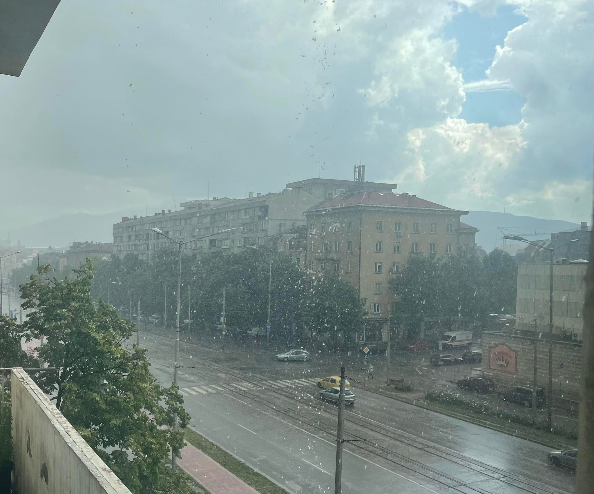 Поредна пролетна буря се извива над София. Над града притъмня, вали проливен дъжд.