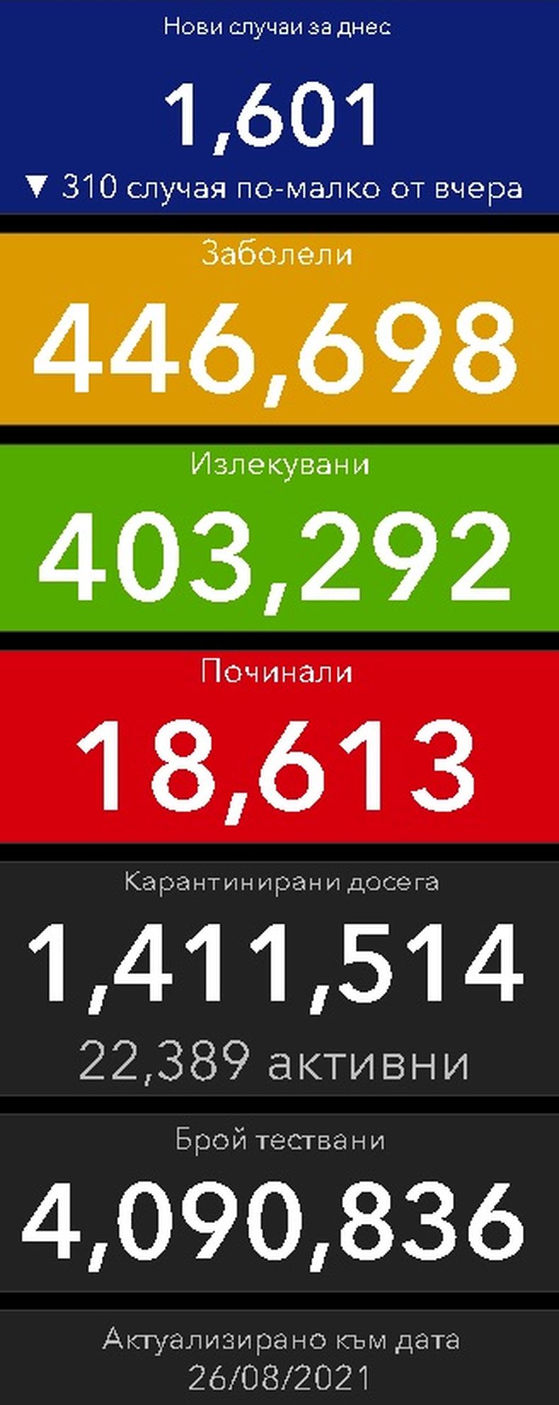 ПОСЛЕДНИ ДАННИ! 1 601 нови случая на COVID-19 у нас. Починалите за денонощието са 48
