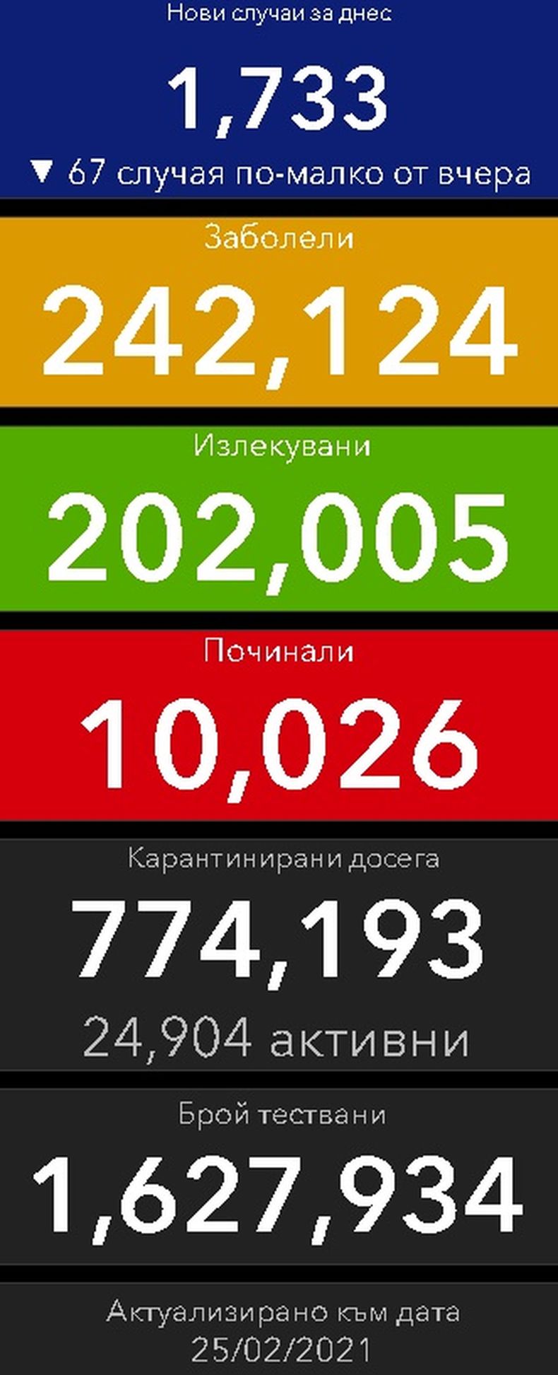 Според статистиката там новозаразените са 1 733 или с 67 случая по-малко от предното денонощие. Изследвани са общо 12 066 проби за денонощието.