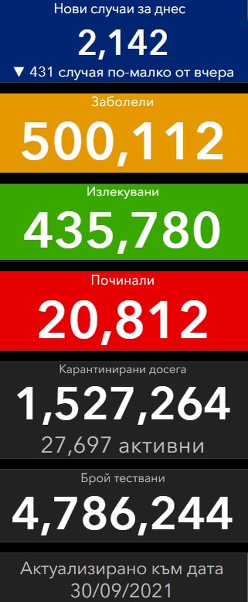 ПОСЛЕДНИ ДАННИ! 2 142 нови случая на COVID-19 у нас. Починалите за денонощието са 87