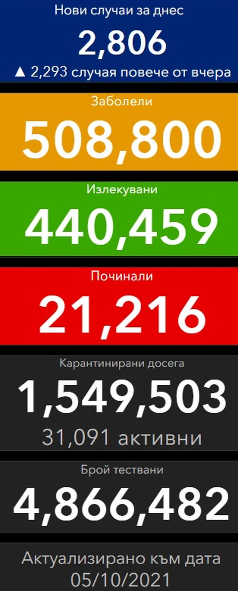 ПОСЛЕДНИ ДАННИ! 2 806 нови случая с коронавирус у нас. Починалите за денонощието са 178
