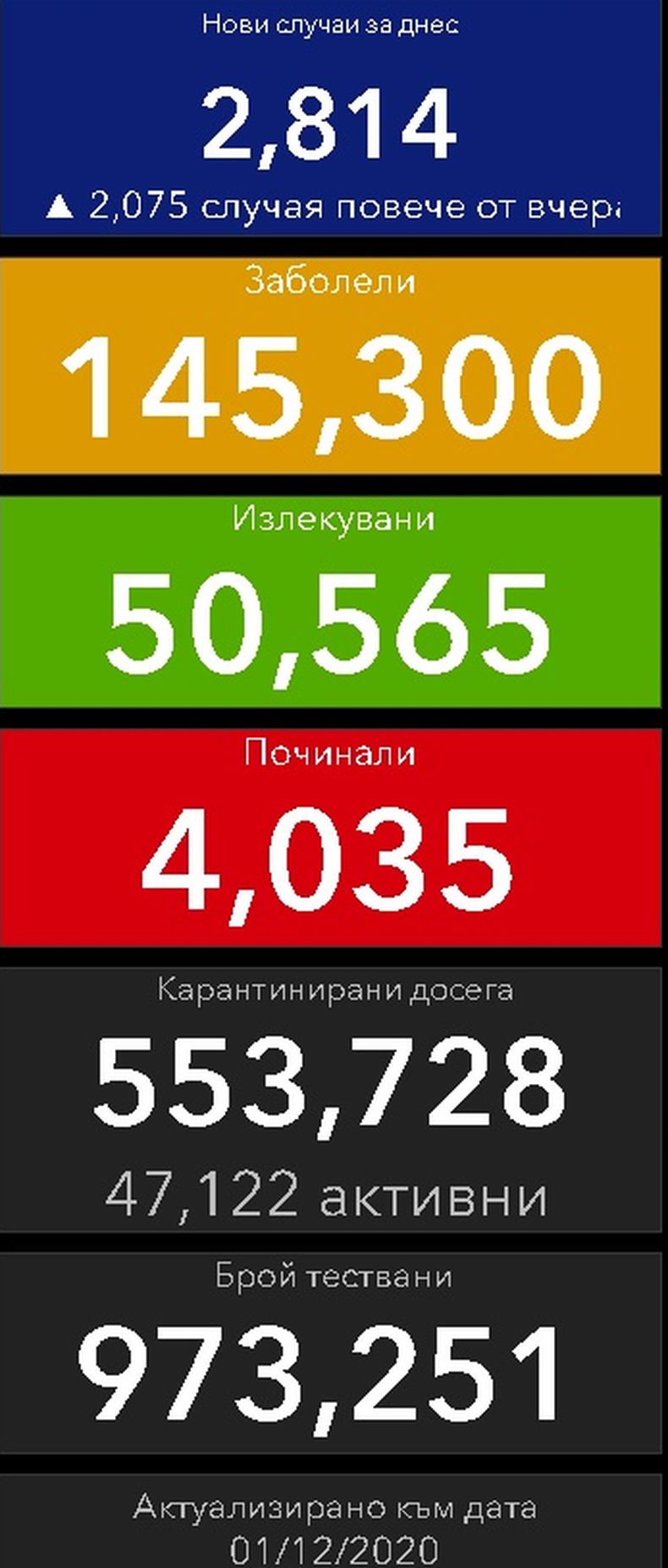 Според статистиката там новозаразените са 2 814 или с 2 075 повече от предния ден. Изследвани са общо 6 825 проби за денонощието.