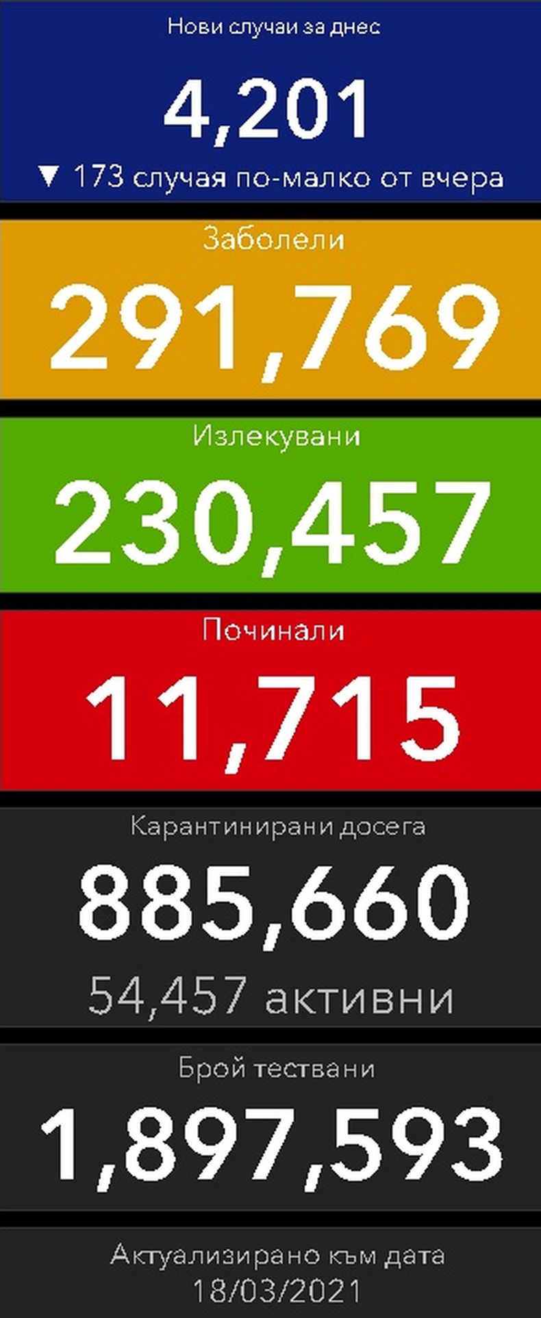 Според статистиката там новозаразените са 4 201 или със 173 случая по-малко от предното денонощие.