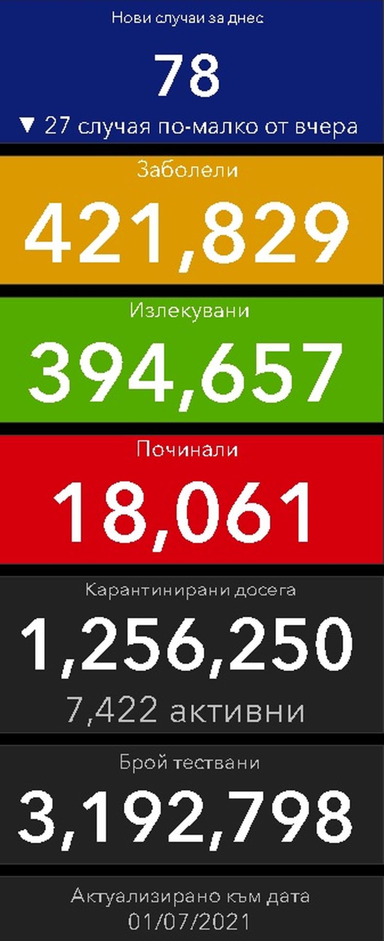 Според статистиката там новозаразените са 78 или с 27 случая по-малко от предното денонощие.