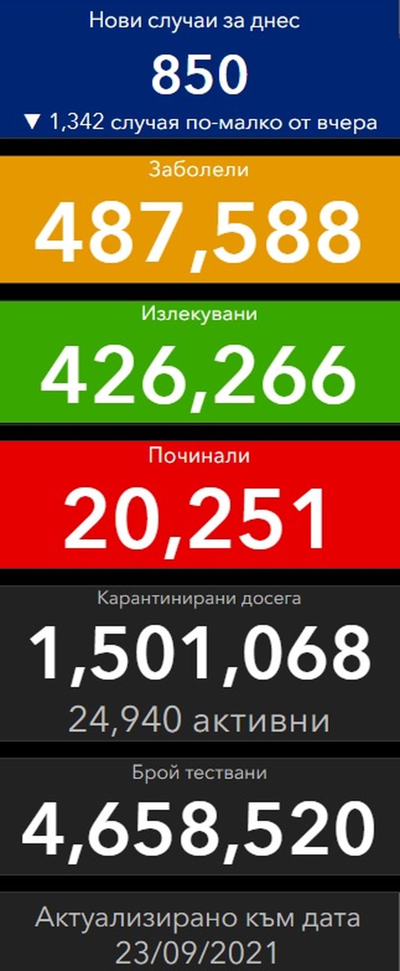 ПОСЛЕДНИ ДАННИ! 850 нови случая на COVID-19 у нас. Починалите за денонощието са 27