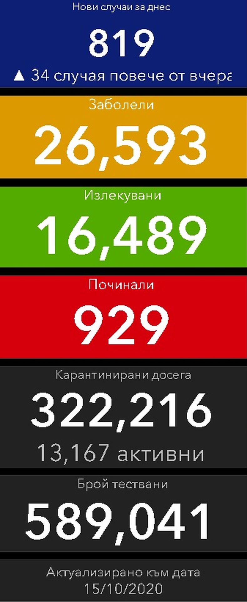 26 593 са вече положителните проби на заразени с коронавирус у нас. Това сочи справката на Единния информационен портал, обновен с данните от изследваните през вчерашния 15 октомври, видя ПИК. 9 175 са активните случаи.