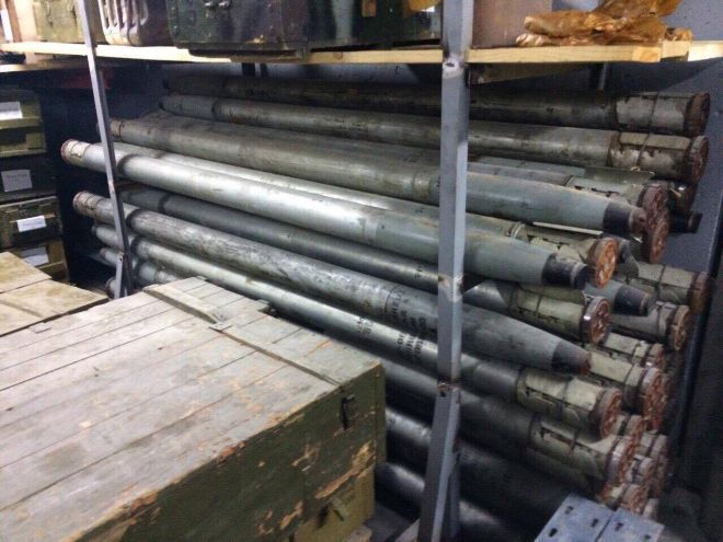 “По време на обиск служителите на реда са намерили 60 предмета, които външно приличат на ракети за ракетните установки “Град”, два предмета, приличащи на пехотни оръжия, 4 предмета, които приличат на боеприпаси за портативна противоракетна система ПЗРК, около 200 единични оръжия, приличащи на противотанкови мини, противотанков гранатомет СПГ, ръчен противотанков гранатомет и бронебойни снаряди. В помещението имаше и бронетранспортьор”.