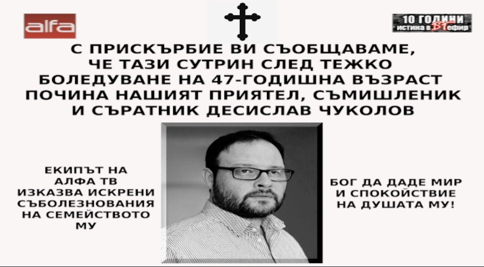 “С прискърбие ви съобщаваме, че тази сутрин след тежко боледуване на 47-годишна възраст почина нашият приятел, съмишленик и съратник Десислав Чуколов”, съобщават от телевизията.