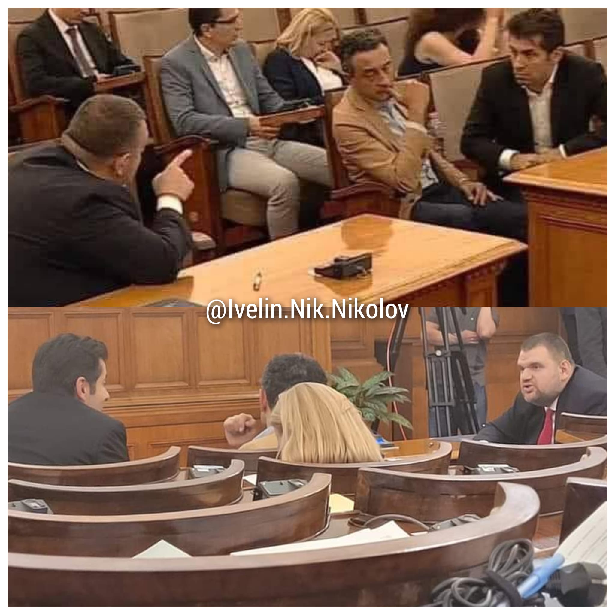 Уникални снимки как Делян Пеевски се кара на Кирил Петков, който стои мирно и гледа гузно, се разпространяват във Фейсбук.