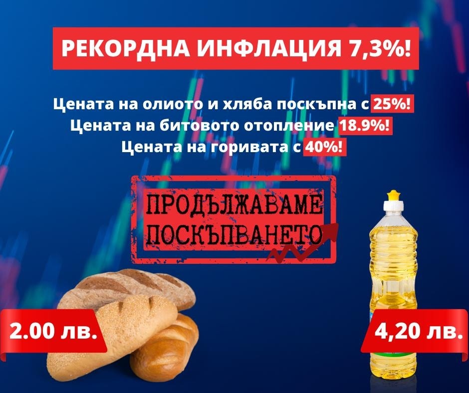 За пример се дава поскъпването на хляба и олиото с над 25%. Така в момента хлябът минава 2 лв., а цената на олиото варира от 4,20 до 8,00 лв.
