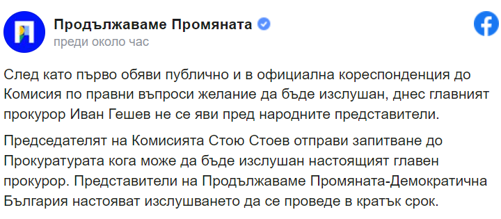 Представители на „Продължаваме промяната”-„Демократична България” настояват изслушването на главния прокурор Иван Гешев да се проведе в най-кратък срок. Това пише в социалната мрежа Facebook на страницата на партията. „Както и със създаването на комисията относно имунитетите днес, целта е пълна публичност и прозрачност”, се казва в позицията.