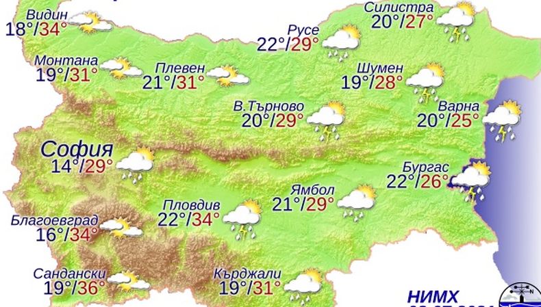 Максималните температури ще са от 24 – 26 градуса в североизточните райони и по Черноморието до 35 – 36 градуса в крайните югозападни.