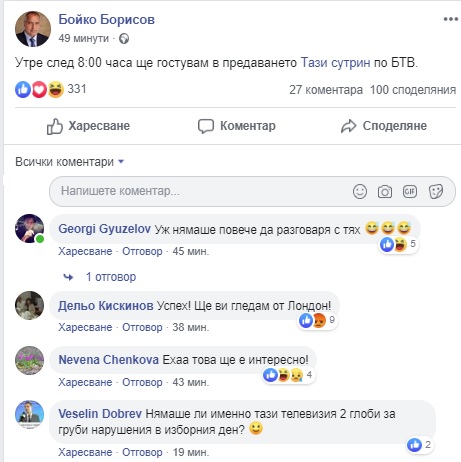 Гостуването на Борисов се случва няма и 5 дни след като в неделя вечер той заяви, че няма да разговаря с Би Ти Ви заради безпрецедентната пропаганда с менте кадри и манипулирани репортажи срещу кметовете на ГЕРБ. Припомняме, че почти през целия изборен ден на първия тур, Би Ти Ви не спря да показва съвсем изкривена картина от България, внушавайки колко е зле всичко при настоящото управление и градоначалниците на партията на премиера.