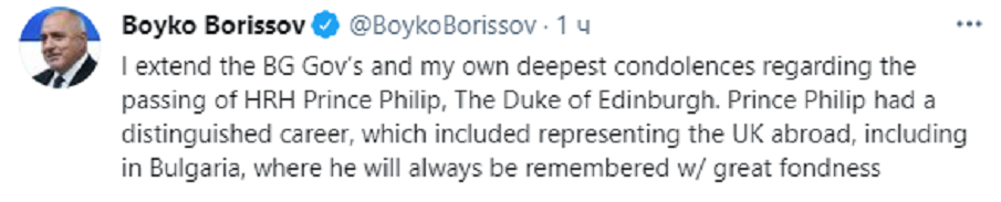 Премиерът Бойко Борисов изрази съболезнования по повод смъртта на принц Филип, херцогът на Единбург. В Туитър той обяви, че съпругът на кралица Елизабет II ще бъде запомнен с голяма любов в страната ни.