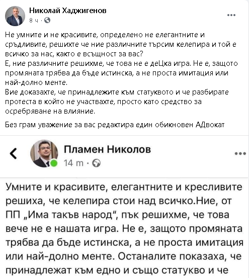 Поредна буря на политическата сцена. Фейсбук пост и отговор между предложеният за проектокабинет от "Има такъв народ", който вчера се оттегли по "лични причини" и депутатът от "Изправи се БГ! Ние идваме!" адв. Николай Хаджигенов.