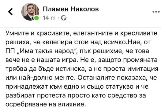 "Умните и красивите, елегантните и кресливите решиха, че келепирът стои над всичко. Ние, от ПП „Има такъв народ“, пък решихме, че това вече не е нашата игра. Не е, защото промяната трябва да бъде истинска, а не проста имитация или най-долно менте. Останалите показаха, че принадлежат към едно и също статукво и че разбират протеста просто като средство за осребряване на влияние."