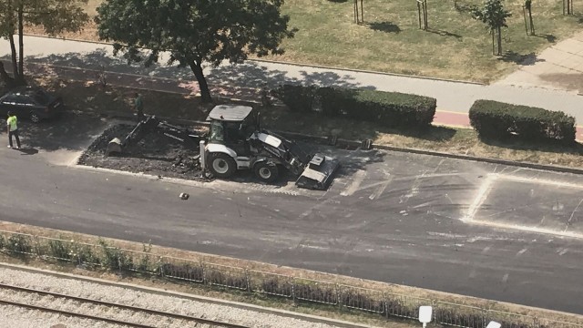 Снимки показват, че току-що положеният асфалт се реже, за да се закърпи наново.