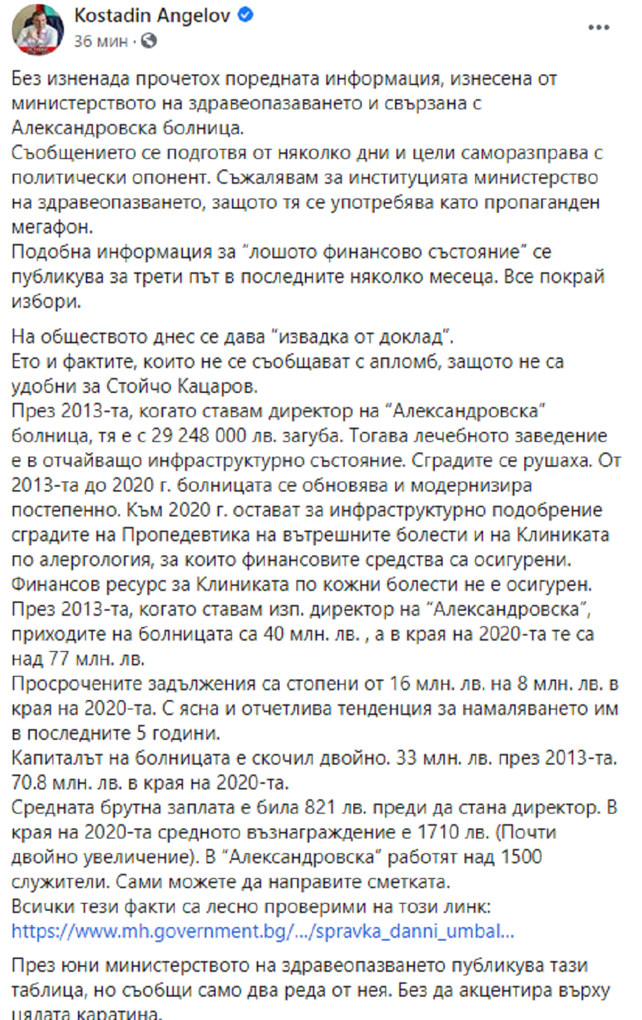 "Днешната атака на Стойчо Кацаров е опит за сплашване. Няма да ми запушите устата! Нито ще ме уплашите с политически натиск! Кой финансира НПО-то на Кацаров преди да стане министър? Организацията получава стотици хиляди левове годишно. Това е видно от финансовите отчети в Търговския регистър. Дали не е Търговска лига? Дали не е Чайкафарма?" Това написа във "Фейсбук" бившият здравен министър проф. Костадин Ангелов. Според него срещу му се извършва политическа саморазправа.