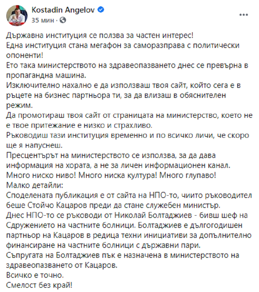Държавна институция се ползва за частен интерес! Една институция стана мегафон за саморазправа с политически опоненти! Ето така министерството на здравеопазването днес се превърна в пропагандна машина.