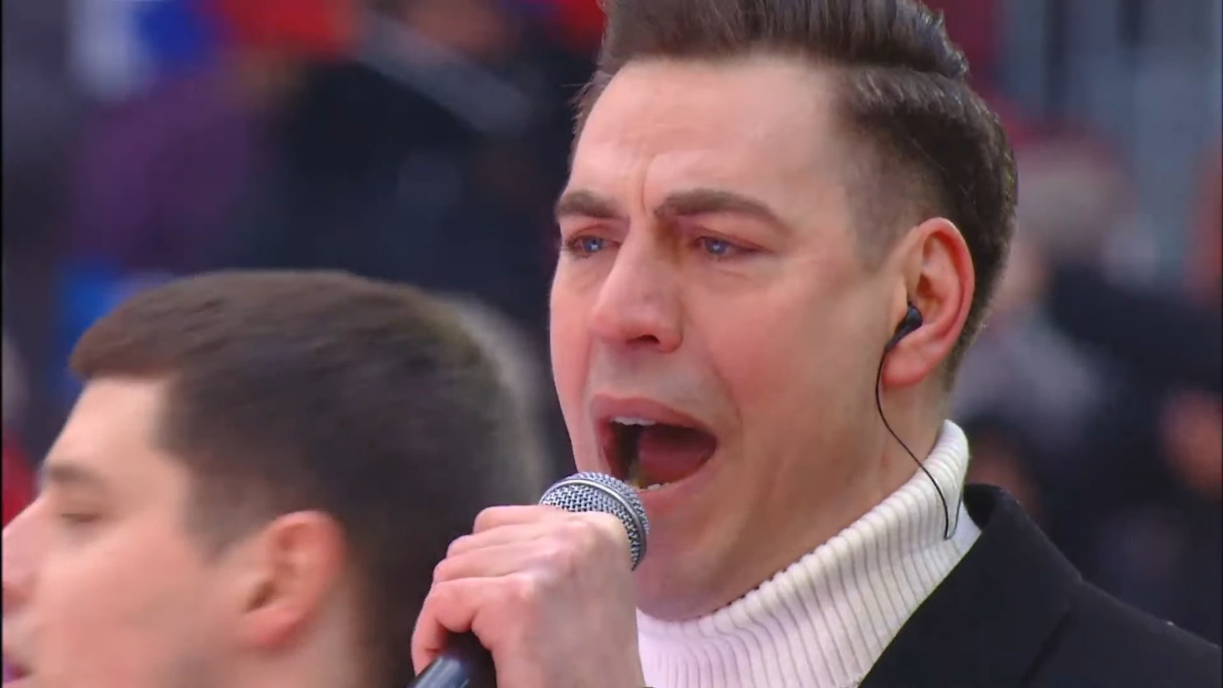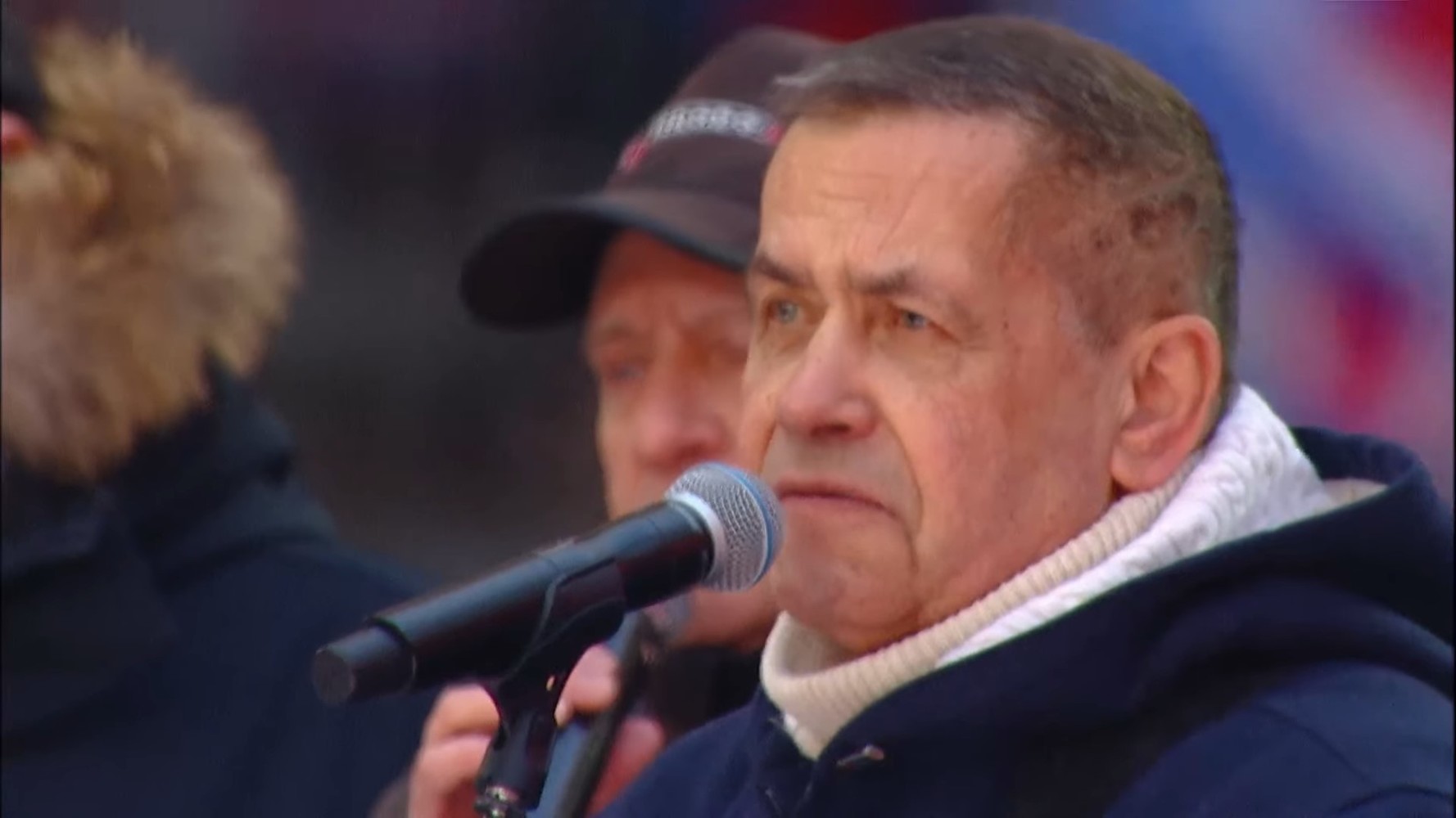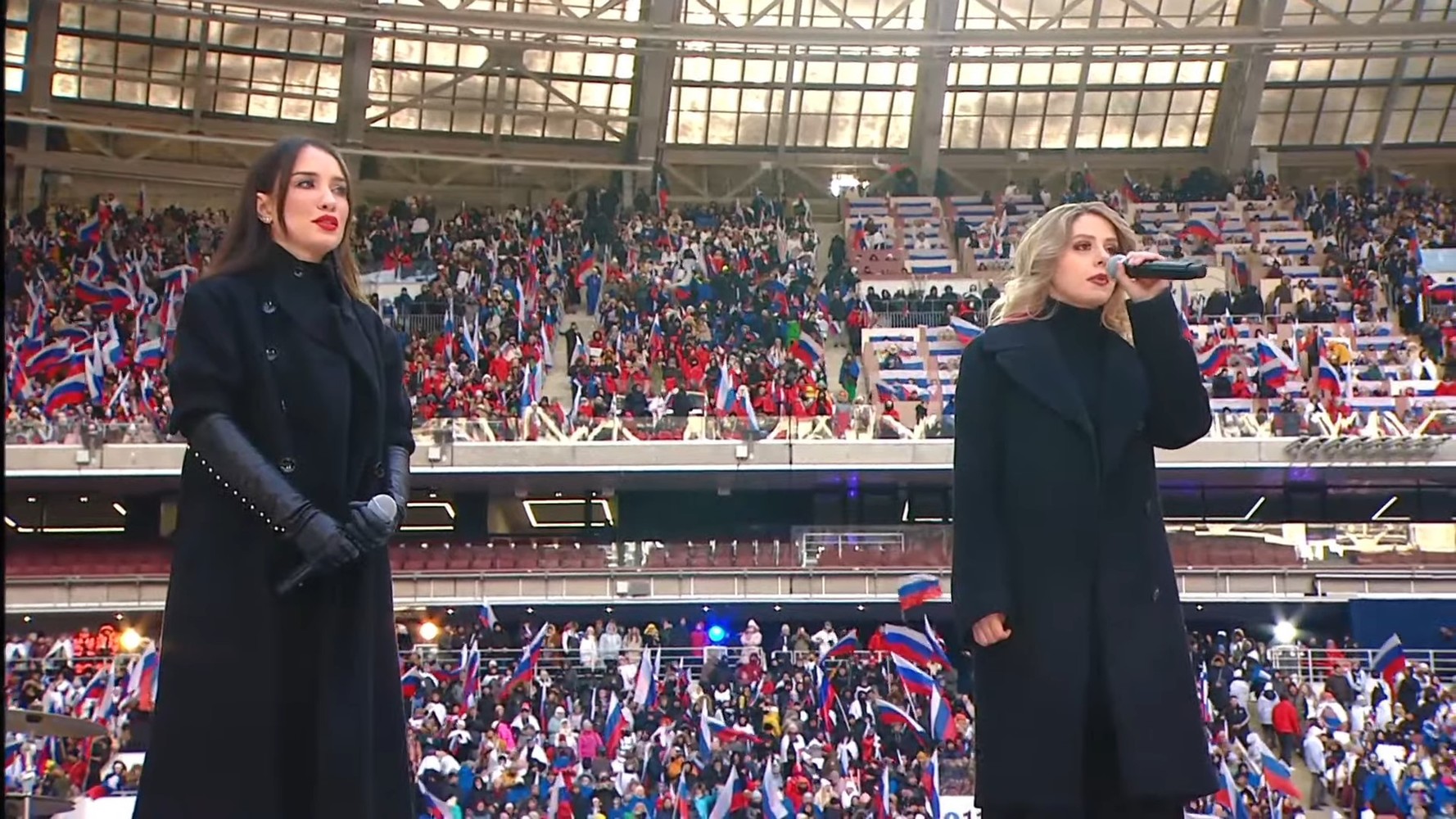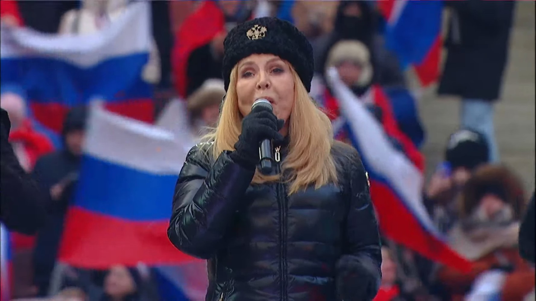 При минус 15 градуса по Целзий публиката развяваше стотици руски знаменца, докато на сцената се сменят изпълнители на патриотични песни и руски военни, сражавали се на украинския фронт, посочва АФП.