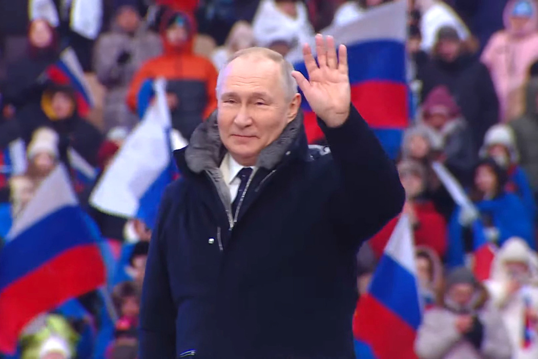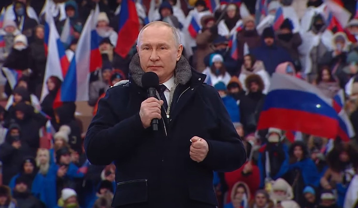 Путин говори на голям патриотичен концерт, организиран от властите в подкрепа на офанзивата в Украйна и събрал на стадиона десетки хиляди хора, отбелязва Франс прес.