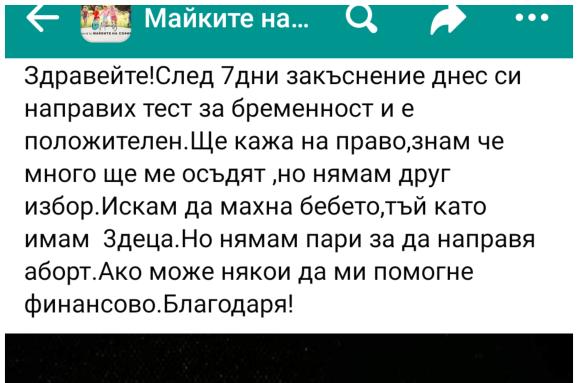 „Здравейте! След 7 дни закъснение - днес си направих тест за бременност и е положителен. Ще кажа направо, знам че много ще ме осъдят, но нямам друг избор. Искам да махна бебето, тъй като имам 3 деца. Но нямам пари, за да направя аборт. Ако може някой да ми помогне финансово. Благодаря!,“ това написа жената във Фейсбук.