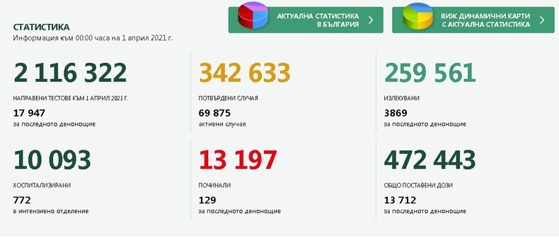 342 633 са вече положителните проби на заразени с коронавирус у нас. Това сочи справката на Единния информационен портал, обновен с данните от изследваните през вчерашния 31 март, видя ПИК. Активните случаи към момента са 69 875.