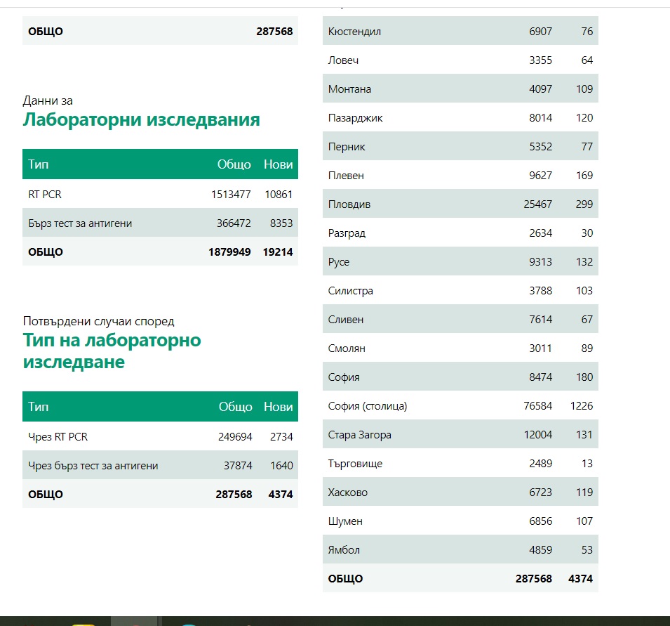 287 568 са вече положителните проби на заразени с коронавирус у нас. Това сочи справката на Единния информационен портал. 47 173 са активните случаи в момента.