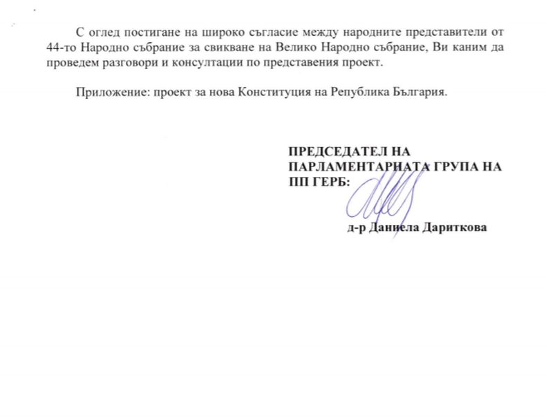 С това ГЕРБ кани на разговори и консултации по представения проект всички парламентарни групи с цел да бъде постигнато широко съгласие между народните представители за свикване на Велико народно събрание.
