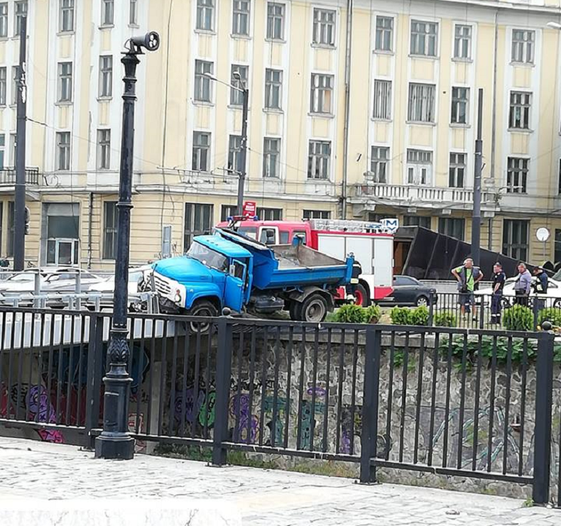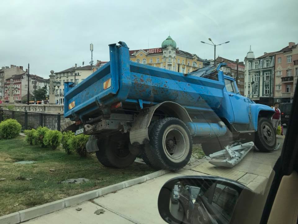 Зрелищна каскада в центъра на София! Стар самосвал ЗиЛ помете ажурната ограда на "Лъвов мост" и кацна върху мантинелата, сигнализираха агенция ПИК свидетели на катастрофата.
