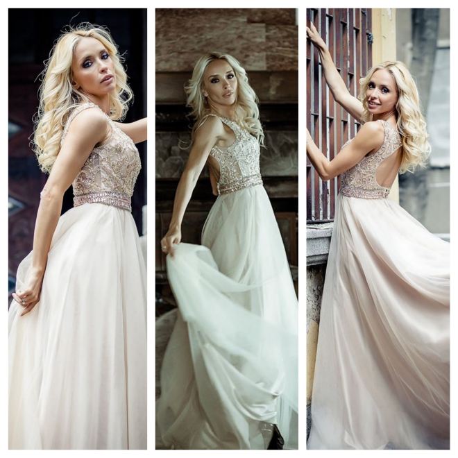 Шехтова е с рокли от новата колекция висша мода на София Борисова, в която дизайнерката е заложила на ефирни материи с фини бродерии, дантели и флорални мотиви.