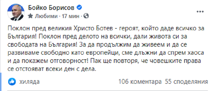 “Поклон пред великия Христо Ботев - героят, който даде всичко за България!". Това написа във Фейсбук лидерът на ГЕРБ Бойко Борисов по повод на днешния 2 юни.