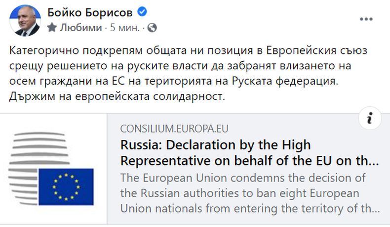 Премиерът в оставка Бойко Борисов сподели, че напълно подкрепя позицията на ЕС дреку решението на Русия да забрани влизането на осем граждани на ЕС.