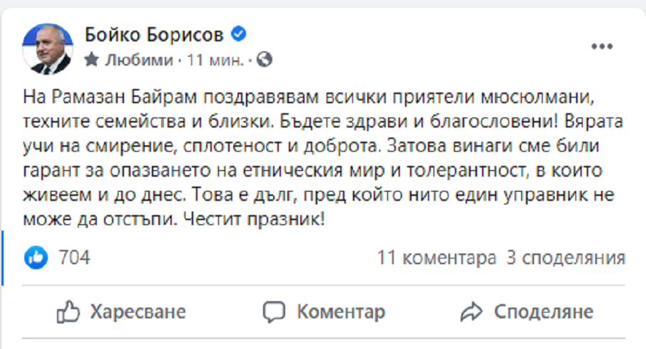 "На Рамазан Байрам поздравявам всички приятели мюсюлмани, техните семейства и близки. Бъдете здрави и благословени! Вярата учи на смирение, сплотеност и доброта. Затова винаги сме били гарант за опазването на етническия мир и толерантност, в които живеем и до днес. Това е дълг, пред който нито един управник не може да отстъпи. Честит празник!", обърна се Борисов към нашите сънародници, които празнуват днес.