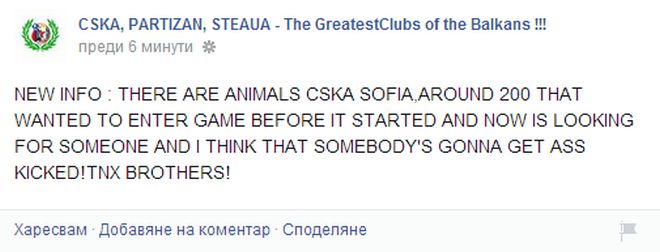 Оказало се, че около 200 фенове от фракцията на ЦСКА "Анималс" са отишли в залата, да подкрепят "братята" си от Партизан.