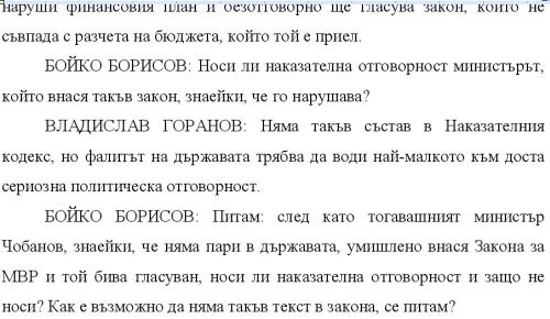 БОЙКО БОРИСОВ: Питам: след като тогавашният министър Чобанов, знаейки, че няма пари в държавата, умишлено внася Закона за МВР и той бива гласуван, носи ли наказателна отговорност и защо не носи? Как е възможно да няма такъв текст в закона, се питам?