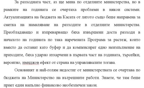 За разходната част, аз ще мина по отделните министерства, но в рамките на годината се очертаха проблеми в някои системи. Актуализацията на бюджета на Касата от лятото също беше направена за сметка на намаляване на разходите в отделните министерства. Преобладаващо и изпреварващо бяха извършени доста разходи в началото на годината по така наречената Програма за растеж, които вместо да останат като буфер и да компенсират едно неизпълнение на приходите, бяха ударно изхарчени в първата част на годината, търсейки, вероятно, имиджов ефект от страна на управлявалите тогава.