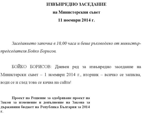 БОЙКО БОРИСОВ: Дневен ред за извънредно заседание на Министерски съвет – 1 ноември 2014 г., вторник – всичко се записва, води се и след това се качва на сайта!