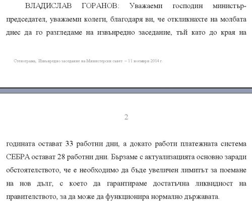 ВЛАДИСЛАВ ГОРАНОВ: Уважаеми господин министър-председател, уважаеми колеги, благодаря ви, че откликнахте на молбата днес да го разгледаме на извънредно заседание, тъй като до края на годината остават 33 работни дни, а докато работи платежната система СЕБРА остават 28 работни дни. Бързаме с актуализацията основно заради обстоятелството, че е необходимо да бъде увеличен лимитът за поемане на нов дълг, с което да гарантираме достатъчна ликвидност на правителството, за да може да функционира нормално държавата.